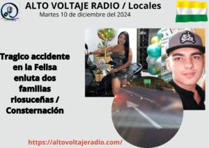 Luisa Carmona Noreña y Miguel Ángel Ceballos , ambos riosuceños tiene consternada a la población riosuceña.   En la tarde ayer lunes 9 de diciembre se registró un accidente de tránsito en vía nacional que conecta hacia Medellín, en el sector conocido como El Puente jurisdicción de La Merced.Según información preliminar las dos personas que se desplazaban en la motocicleta de La Merced hacia Riosucio fallecieron en el acto luego de colisionar con un camión de carga pesada. El siniestro ocurrió en la vía Panamericana de mucho tráfico la cual estuvo restringida durante varias horas mientras que las autoridades de tránsito y un equipo de criminalística llegaron rápidamente al lugar para realizar el levantamiento de los cuerpos y comenzar con la investigación correspondiente.